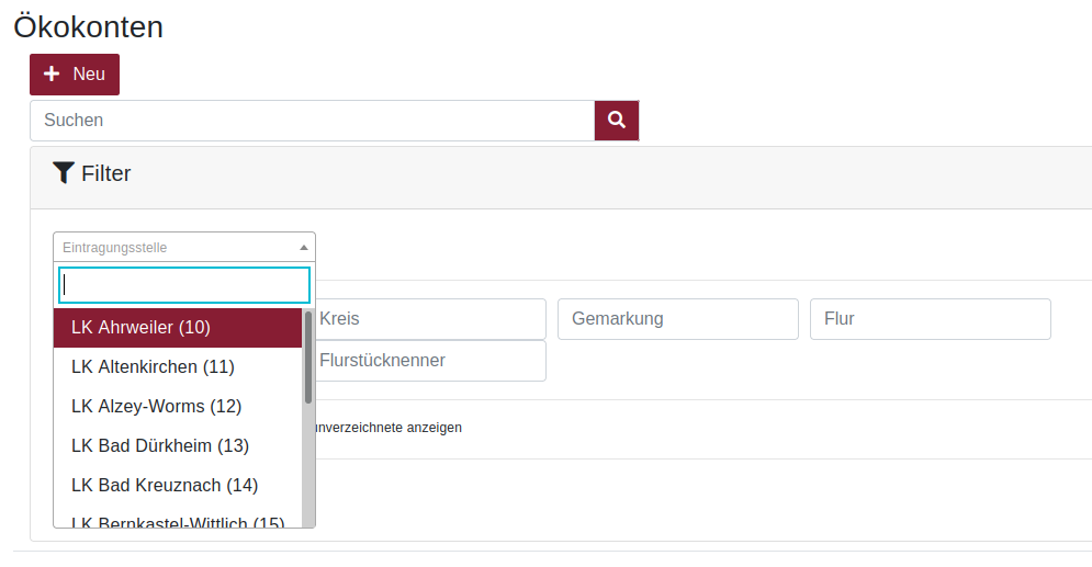 For these data types, we do not need any filter option for registration office (Zulassungsbehörde), since this information does not exist in here. Therefore only filtering by conservation office (Eintragungsstelle) is possible: