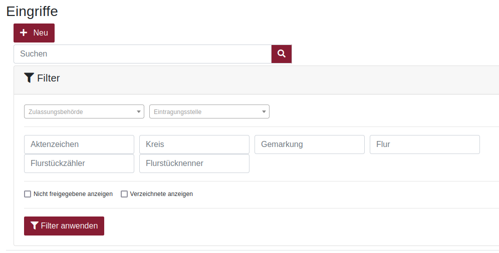 file numberSearchbar, which searches for identifier and title, could be made. This way thefile numberfilter could be used to find matches for both, registration and conservation office file numbersParcelParcel counterParcel numberDistrictRegistration officeConservation officeInterventions/Compensations